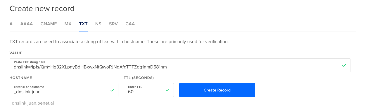 Step 2: Set the DNSLink value on a TXT record